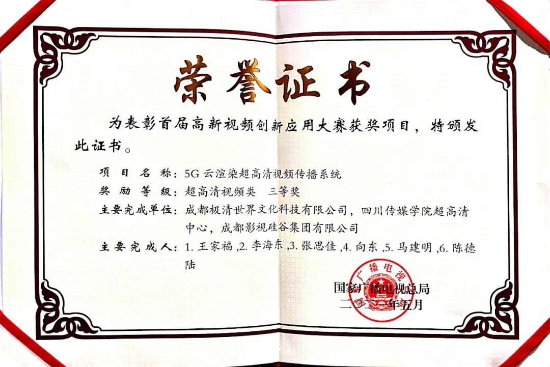 5月27日,国家广电总局首届高新视频创新应用大赛在第28届中国国际广播电视信息网络展览会上(CCBN2021)举行颁奖仪式。由成都影视硅谷集团、四川传媒学院超高清中心、极清世界联合共建的5G云渲染超高清视频传播系统荣获三等奖。