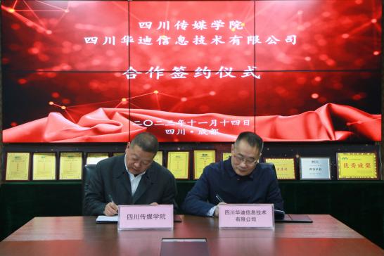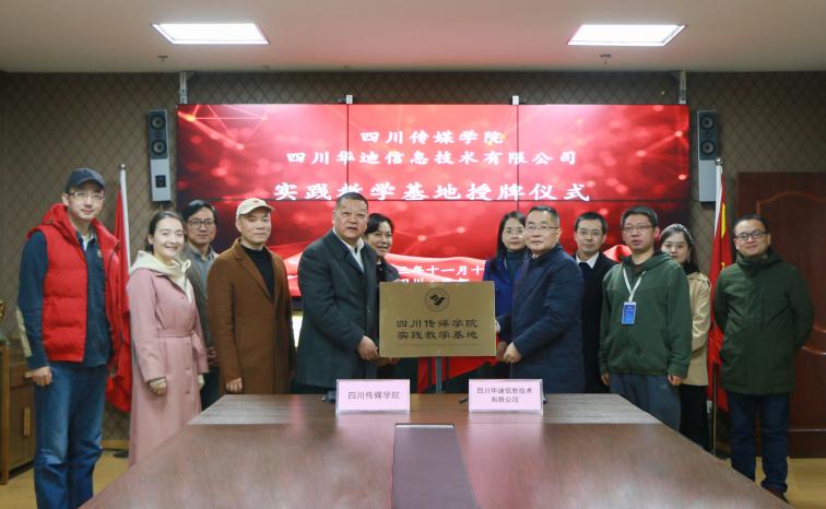 在与会人员的共同见证下,董事长朱军和四川传媒学院数字媒体与创意设计学院院长马建明共同签署了合作协议,并进行了“四川传媒学院实践教学基地”授牌仪式。