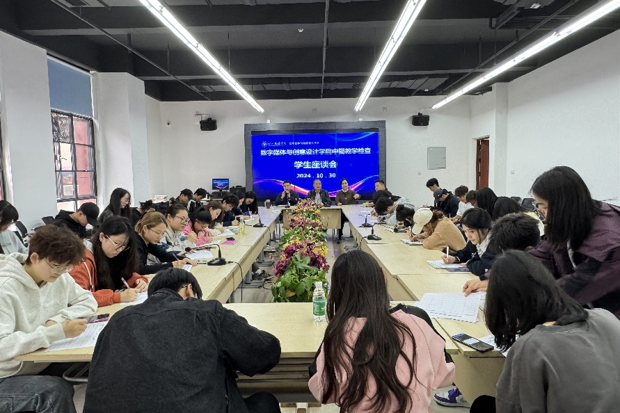 10月30日中午,数字媒体与创意设计学院在学院2212会议室召开中期教学检查学生座谈会。数媒学院马建明院长、李朝林副书记、高晓玲执行院长、教务办主任史进及教务办全体教务员参加了座谈会。来自学院五个本科专业47个班级的50余名学生代表参会。 座谈会由分管教学高晓玲执行院长主持。