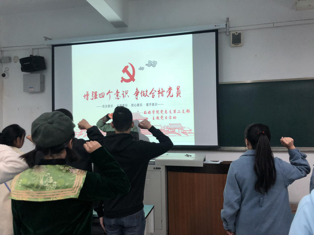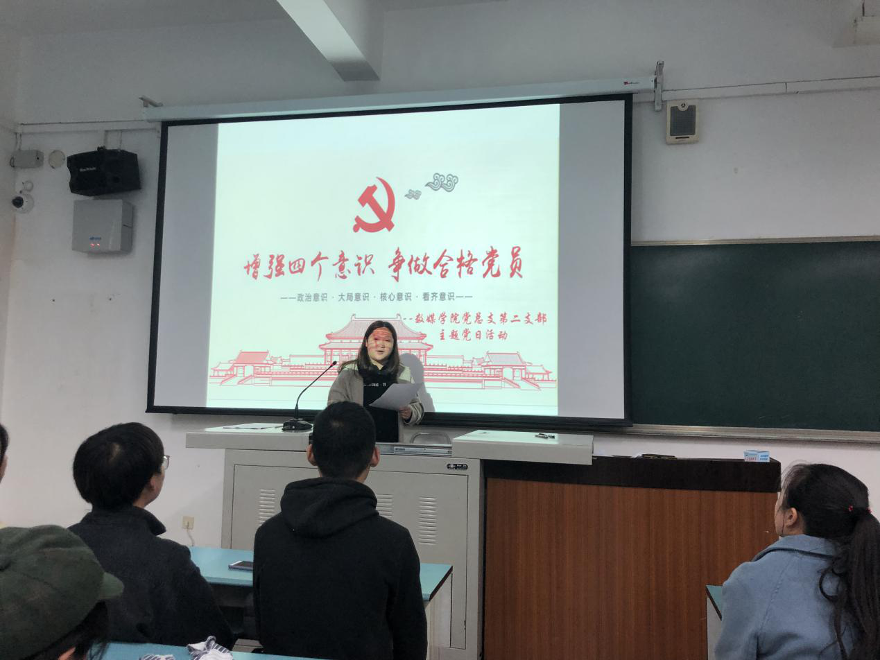 2019年12月10日晚19:30,数媒学院党总支在教学楼A1-210开展"增强四个意识、争做合格党员"的主题党日活动。本次活动主要由全体学生党员、入党积极分子参加。
