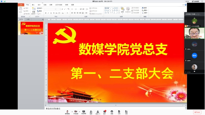 会议开始,由数媒学院党总支书记王北泉讲话,他表示因为疫情原因,经由数媒学院党总支向学校党委申请并同意通过组织云端会议召开支部大会。本次大会主要有两项议程:关于讨论入党积极分子是否通过接收为预备党员和关于预备党员同志转正的相关事宜。