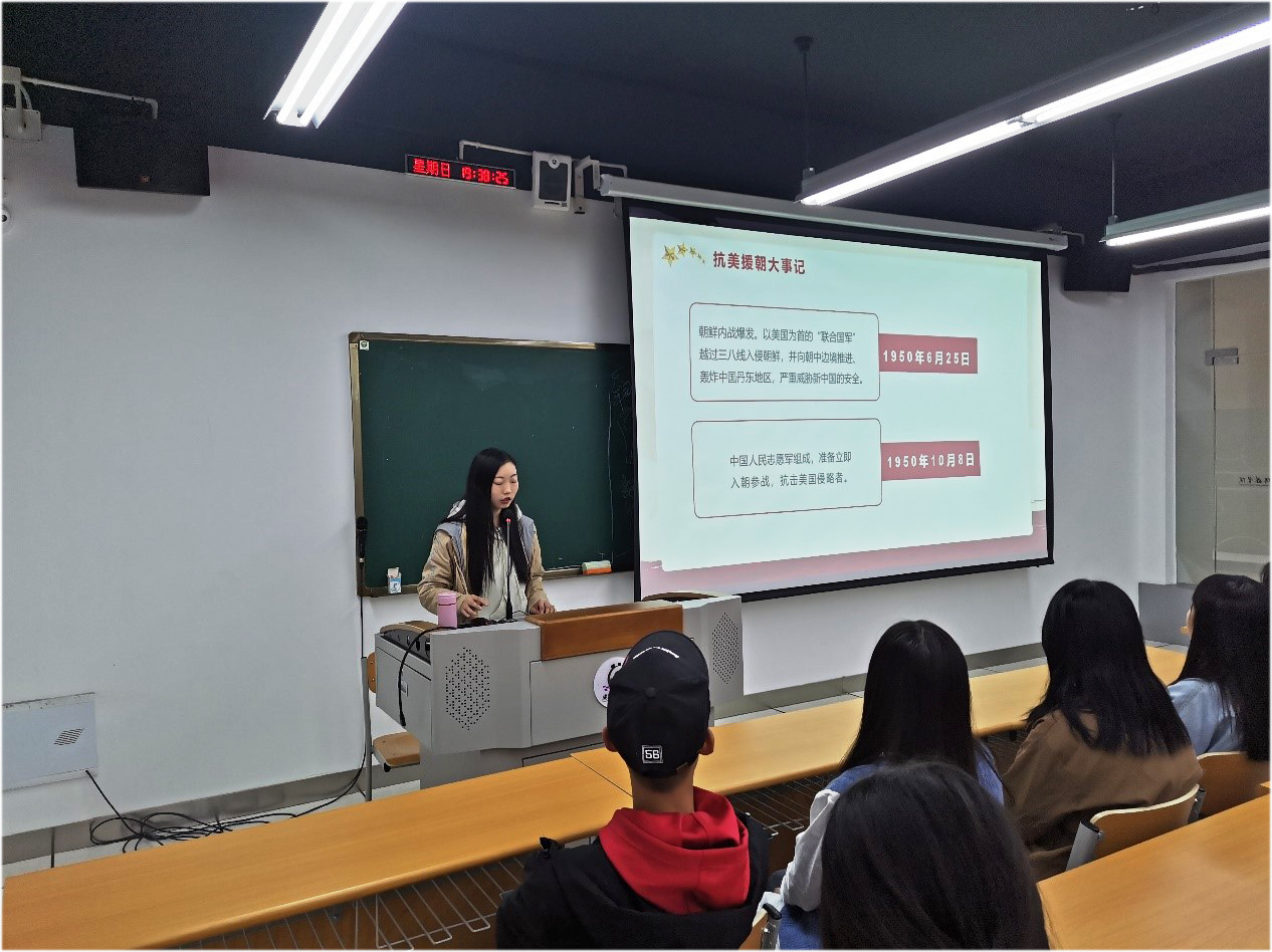 活动第二部分由2019数字媒体技术本科02班团支书余文秀同学向大家介绍抗美援朝战争有关历史事件、英雄人物及抗美援朝的当代意义和价值。——70年前,由中华优秀儿女组成的中国人民志愿军,肩负着人民的重托、民族的期许,高举反抗侵略、保卫和平的旗帜,雄赳赳、气昂昂,跨过鸭绿江……滚滚流淌的鸭绿江水,倒映着残垣上累累弹孔,见证了一批批人民志愿军为了正义而浴血奋战的悲壮史歌。——70年后,我们站在实现“两个一百年”奋斗目标的历史交织线上,憧憬着中华民族伟大复兴的美好未来。今天我们都身处和平年代,应更加珍惜这来之不易的学习环境。