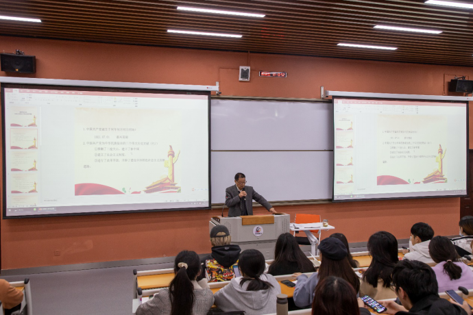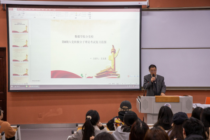 2020年11月13日星期五,数字媒体与创意设计学院第八期入党积极分子培训班集中党课第六讲在2A9—107室开讲。本讲课主要为了迎接十一月底的入党考试,由数字媒体与创意学院党总支书记王北泉老师主讲,数媒学院150余位优秀学生参加了本次党课的学习。