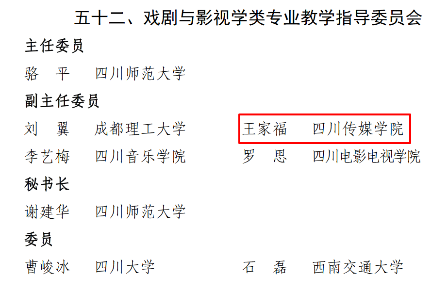 热烈祝贺我院王家福教授当选“2021-2025 年四川省普通本科高等学校教学指导委员会—戏剧与影视学类专业教学指导委员会”副主任委员