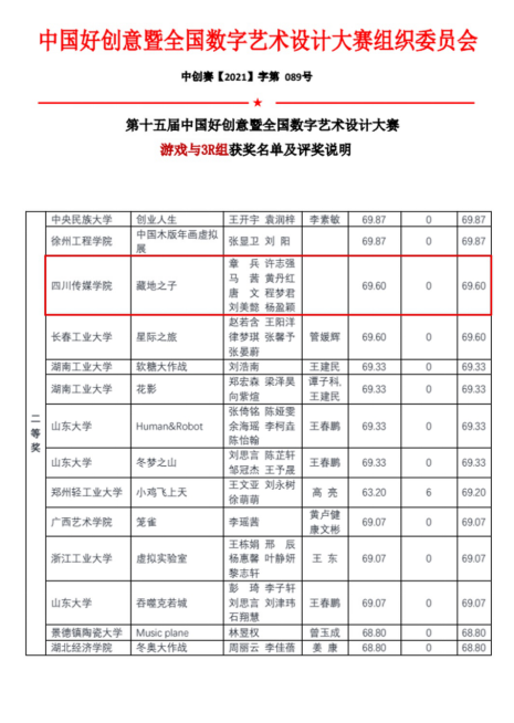 2021年10月,四川传媒学院数字媒体与创意设计学院新媒体艺术和动画等多个专业多名学生参加了2021中国好创意大赛。由赵学泰老师指导的学生作品获一等奖两项,二等奖一项,马茜老师等参与作品获二等奖一项,章兵老师参与及指导的作品获二等奖三项,黄丹红老师指导学生作品获优秀奖一项。