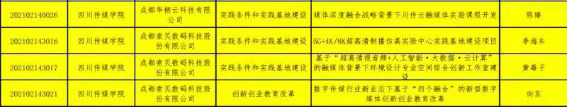 近日,教育部高等教育司公布2021年第二批产学合作协同育人立项名单,四川传媒学院数字媒体与创意设计学院两项目成功获批入选。入选项目分别为四川传媒学院数媒学院副院长向东教授牵头负责的《数字传媒行业新业态下基于“四个融合”的新型数字媒体创新创业教育改革》,以及数字媒体技术专业主任李海东教授牵头负责的《5G+4K/8K超高清制播仿真实验中心实践基地建设项目》。