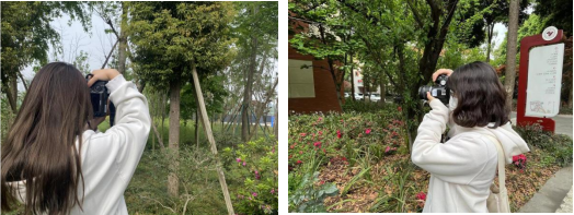 学生采取不同的方式来表达校园优美的景象,拿起相机,按下快门,用照片来记录自己的艺术作品。