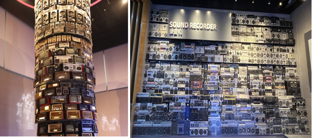 馆内标志性装置,由老广播电视器材构成的艺术装置,有500多台电子管电视机、收音机垒成的8米高的“光影时空塔”。 300多收录机组成的“收录机墙”