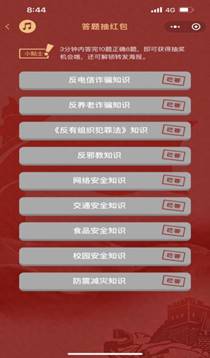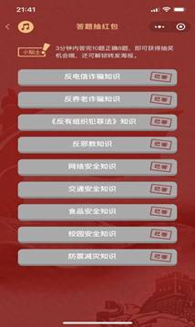 本次知识竞赛的题目内容,主要围绕反网络电信诈骗、反养老诈骗、反邪教、《反有组织犯罪法》、网络安全、交通安全、食品安全、校园安全、防震减灾等9个方面知识,分板块设置题库和学习资料。