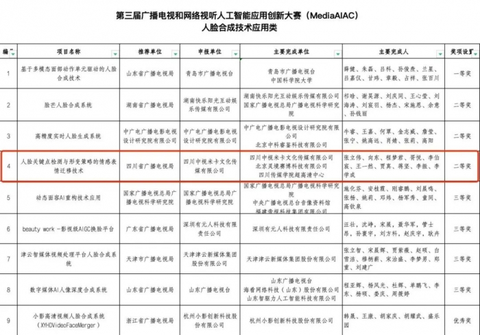 本次大赛旨在鼓励和推动广播电视和网络视听行业的人工智能应用创新,以适应和引领数字化时代的发展需求。大赛评选出了虚拟数字人、视频修复、人脸合成、场景生成和智能推荐等5个赛道的一、二、三等奖和入围项目优秀奖。