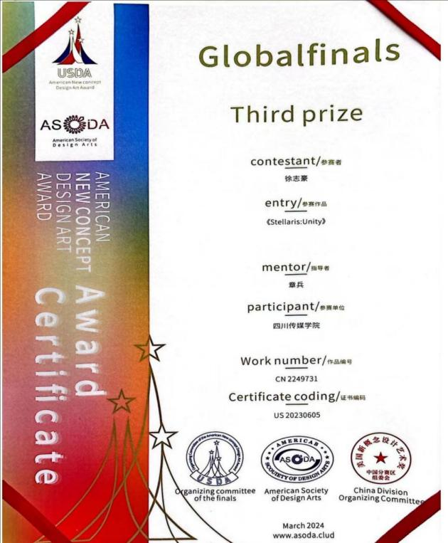徐志豪同学能够在如此激烈的竞争中脱颖而出,充分展现了我院数字媒体艺术专业的教育水平和学生的综合素质。学院对徐志豪同学的获奖表示热烈的祝贺,并对他在数字媒体艺术领域的努力和成绩给予高度评价。