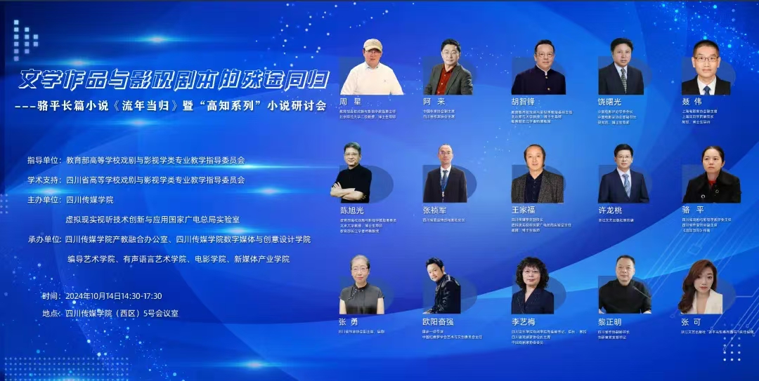 2024年10月14日,总书记主持召开文艺工作座谈会十周年之际,由教育部高校戏剧与影视类教指委指导,四川省戏剧影视教指委学术支持,四川传媒学院主办,四川传媒学院数字媒体与创意设计学院、有声语言艺术学院、电影学院、编导艺术学院、新媒体运营产业学院承办的 “《文学作品与影视剧本的殊途同归》——‘高知系列’研讨会”在川传影视硅谷成功落幕。