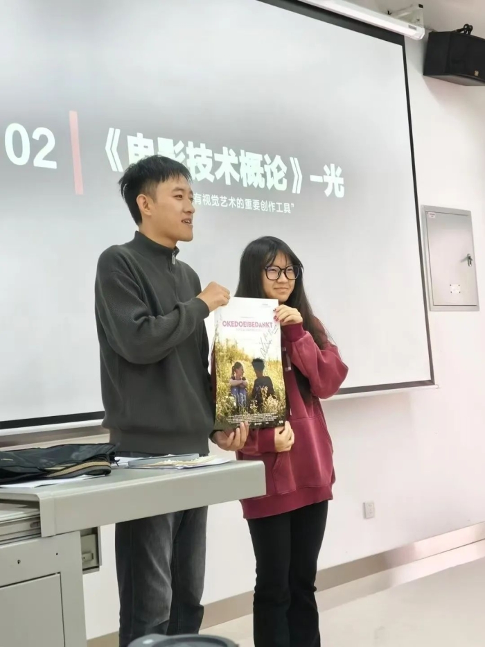 影展归来后,张立伟老师在《电影技术概论》课堂上,将一张珍贵的导演签名海报赠予了2024级电影制作专业黄含韵同学。这份特别的礼物不仅是对学生个人努力的认可,更是电影梦想与精神的传递,激励着更多学子在电影之路上勇敢前行,不断追求艺术真谛。