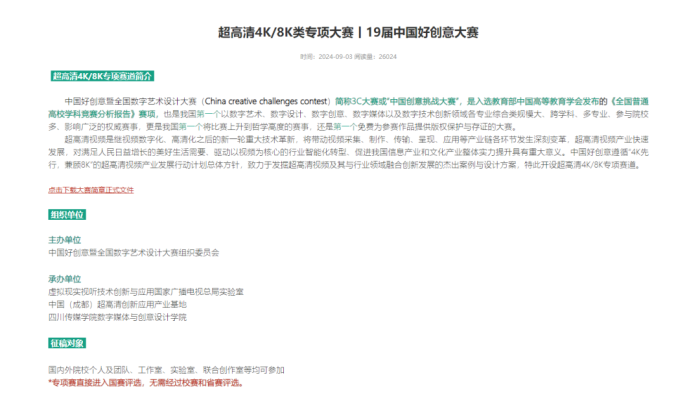 从多年积极参与各类竞赛到如今成功组织并承办“超高清4K/8K类专项大赛丨第19届中国好创意大赛”,这一历程不仅是对数媒学院教学、科研实力的一次全面检验,更是对未来发展方向的一次深刻洞察与实践。数媒师生连续十年如一日坚持 “以赛促教”,赋能数字媒体艺术国家级一流专业建设点取得阶段性系列教研科研成果,数媒学院不仅实现了角色的转变,更是在产教融汇、科教融合方面迈出了坚实的步伐。