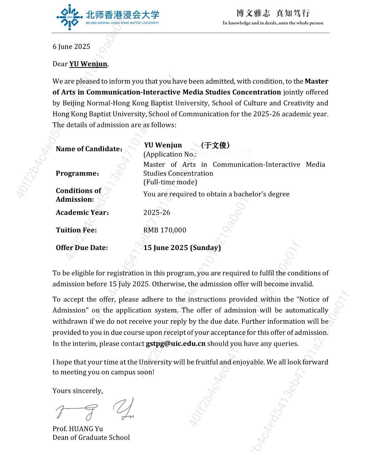 于文俊同学另辟蹊径,凭借丰富的竞赛经历与作品集,成功斩获北师香港浸会大学 2025互动媒体专业硕士研究生的Offer。这份跨学科的升学成果,凸显了专业对学生多元能力的培养 —— 既注重技术硬实力,亦强化创意设计与国际视野,为学生打通国内外深造双通道。