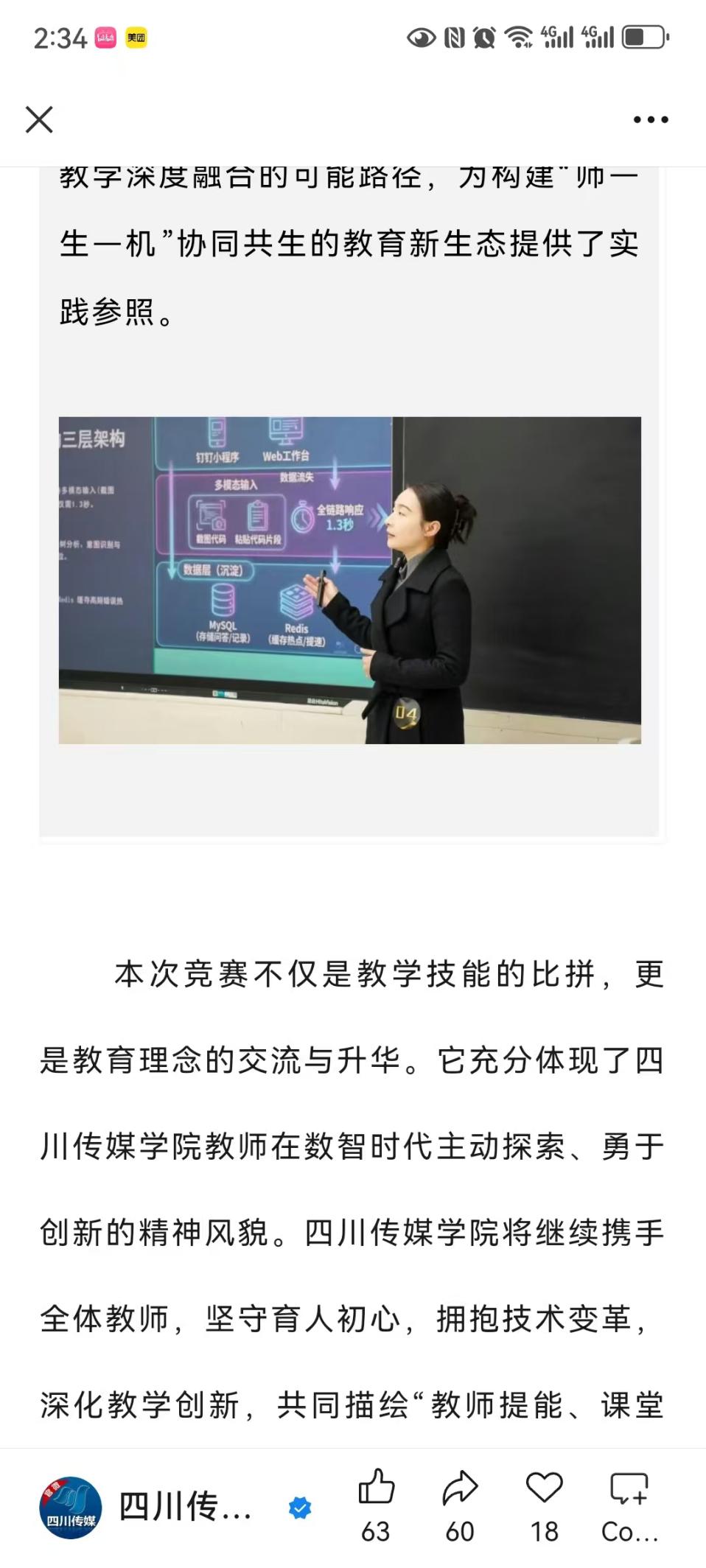 近日,四川传媒学院人工智能创新应用大赛校赛圆满落幕。数字媒体与创意设计学院王潇筱、李敬、罗舒晨和庄栎燊四位老师共同讲授的《高级语言程序设计》课程,凭借扎实的专业功底、创新的技术应用思路及出色的现场展示,成功斩获校赛二等奖,充分彰显了学院教师在人工智能与数字媒体融合领域的教学科研实力与创新风采。