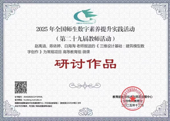 近日,由教育部教育技术与资源发展中心(中央电化教育馆)组织的2025年全国师生数字素养提升实践活动(第二十九届教师活动)评选结果正式揭晓。四川传媒学院数字媒体与创意设计学院微课作品《三维设计基础:建筑模型数字创作》,从全国3718件常规项目参赛作品中脱颖而出,入选常规项目高等教育组微课“研讨作品”,并获得三等奖荣誉。